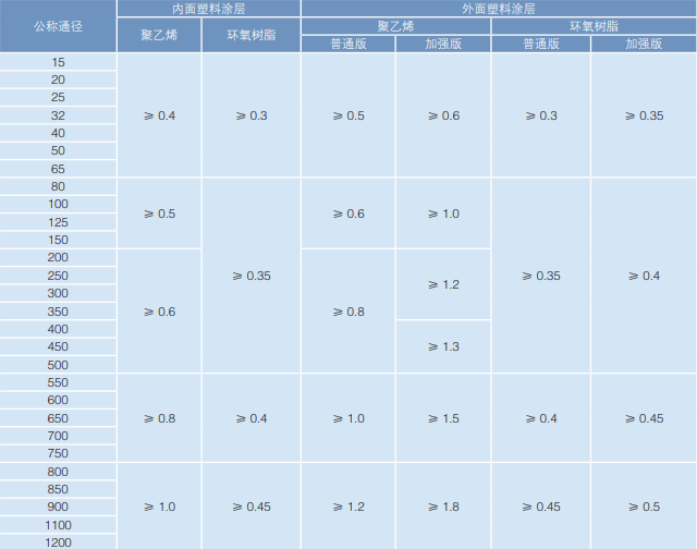 | 钢塑复合管 | DN80-DN125 | 2.0/1.5 | 1.2-1.4 |